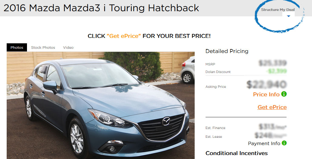 At Dolan Mazda we want to make our customers happy, and if that means making the car buying process faster we are completely onboard. To get to these tools, click on the "structure my deal" button on the top corner of a vehicle page to get started!Â